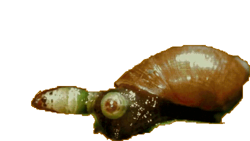 A real snail with a pulsating, green worm-like parasite (Leucochloridium) visible in its eye stalks, creating a hypnotic effect.