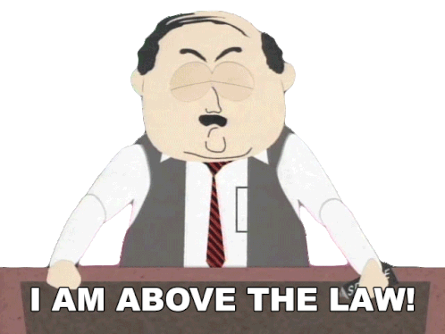 The South Park Producer character declares 'I Am Above The Law!' with an angry expression behind a desk.
