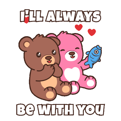 Two adorable teddy bears, one brown and one pink, cuddle together with the loving message 'I'll Always Be With You'.