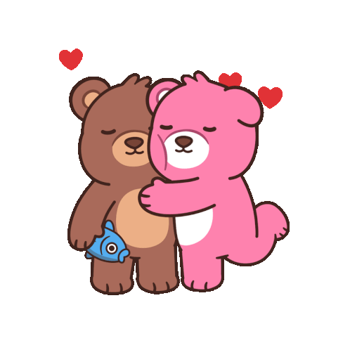 Two adorable cartoon bears, one brown and one pink, share a loving hug with hearts floating around them, symbolizing true friendship.