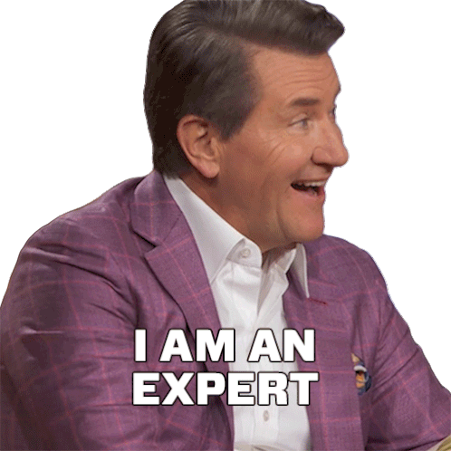 Robert Herjavec from Dragon's Den proudly declares 'I Am An Expert' with a big smile and a pen in hand.