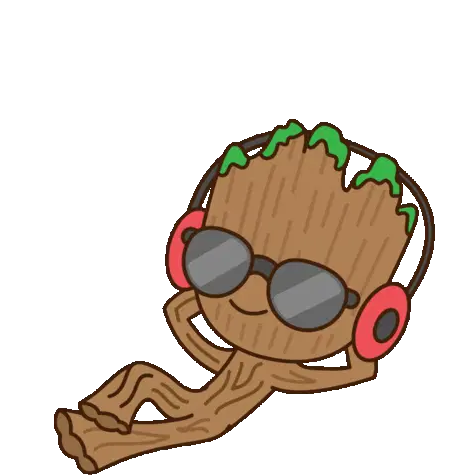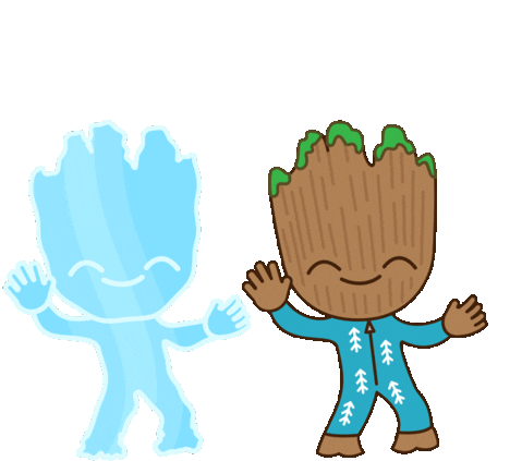 Two adorable I Am Groot characters from Marvel Studios, one translucent blue and one in a cute onesie, smiling and waving.