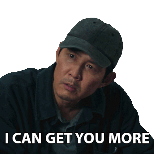 Seong Gi-hun from Squid Game, wearing a baseball cap, says 'I can get you more' with a serious expression.