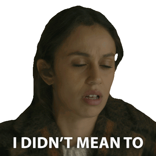 Emmy from Bodkin, played by Robyn Cara, expresses regret with a sad face and the caption 'I didn't mean to'.