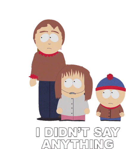Sharon Marsh from South Park stands with Randy and Stan, denying she said anything with a blank expression.
