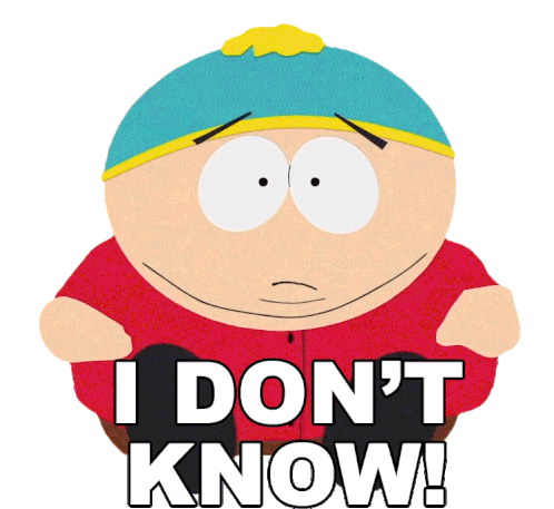 Eric Cartman from South Park shrugs with a confused expression, exclaiming 'I DON'T KNOW!' in this animated sticker.