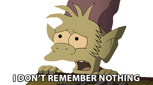 Elfo from Disenchantment looks confused and says, "I don't remember nothing," expressing forgetfulness.