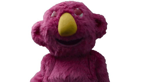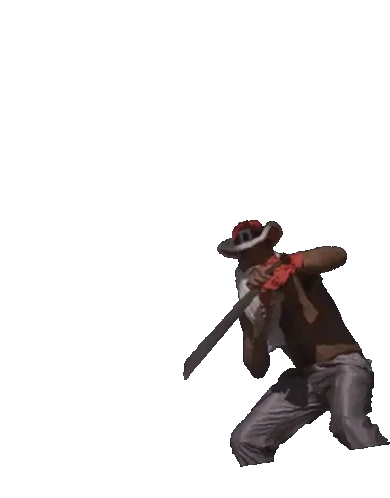 A menacing pink fluffy creature with a yellow beak and red eyes holds a large machete, ready for action.