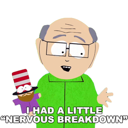 Herbert Garrison from South Park expresses having a little nervous breakdown, holding a small doll and looking worried.