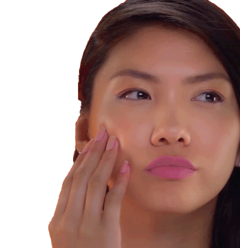 A woman with pink lipstick points her finger up, expressing an "aha!" moment or having a sudden idea.