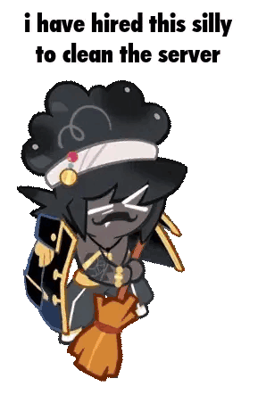 Captain Caviar from Cookie Run Kingdom holds a broom, declaring 'I have hired this silly to clean the server' in this funny sticker.