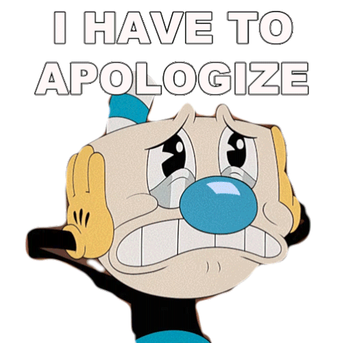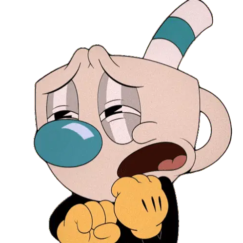 Mugman from The Cuphead Show is deeply saddened, shedding tears while stating, 'I Have To Apologize.' A sincere expression of remorse.