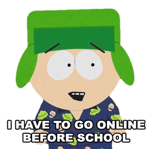 Kyle Broflovski from South Park expresses urgency about needing to go online before school starts.
