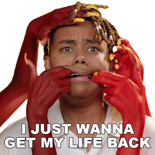 Ybn Cordae looks distressed as red hands pull his face, with the caption 'I JUST WANNA GET MY LIFE BACK'.