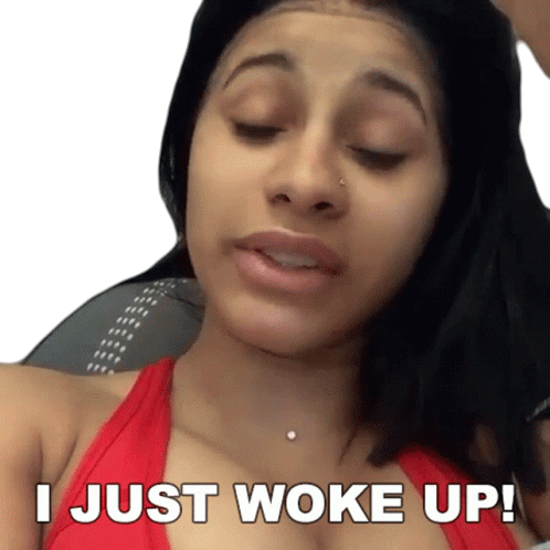 Cardi B looking natural and relatable, saying "I just woke up!" in a red tank top.