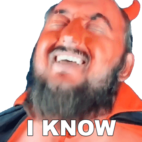 Dj Hunts, with his face painted red and wearing a devil costume, looks knowingly at the camera with the caption "I KNOW."