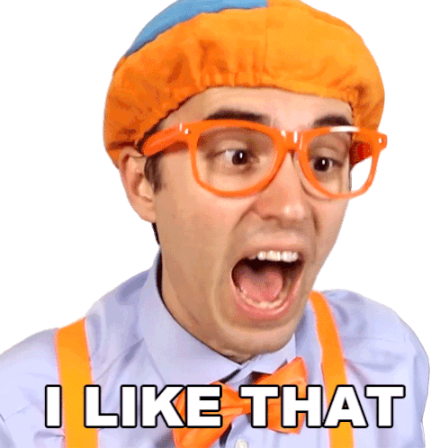 Blippi, the children's entertainer, reacts with an enthusiastic 'I Like That' expression, showing approval.