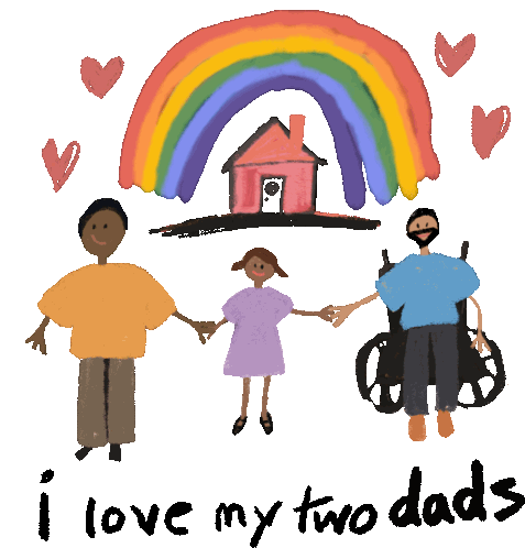 A heartwarming sticker featuring a child holding hands with their two dads under a rainbow, celebrating LGBTQ+ family love.