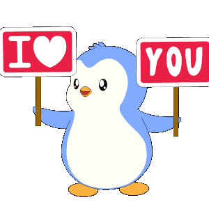 An adorable blue and white penguin holds up two red signs, one saying 'I ❤️' and the other 'YOU', expressing love.