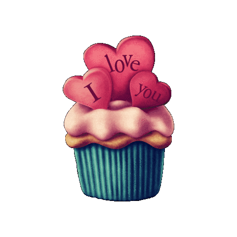 A delightful cupcake with pink frosting, topped with three red hearts spelling out 'I love you' for a sweet message.