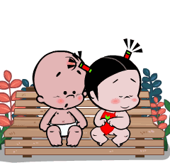 Pobaby and friend share a sweet moment on a bench, with one baby kissing the other's cheek, expressing 'I love you baby!'
