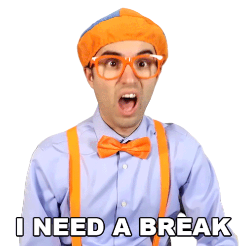 Blippi, the children's entertainer, looks overwhelmed and exclaims 'I NEED A BREAK' with a stressed expression.