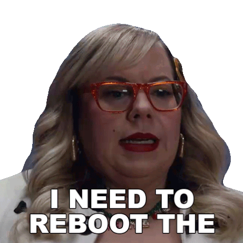 Penelope Garcia from Criminal Minds, wearing glasses and red lipstick, declares 'I need to reboot the system'.