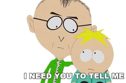 Mr. Mackey intensely questions Butters Stotch, demanding, 'I NEED YOU TO TELL ME EVERYTHING YOU KNOW' from South Park.