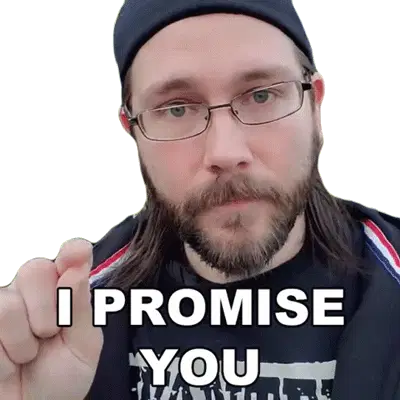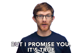 A man with glasses and a beard points his fingers, reassuring the viewer with the phrase 'But I promise you, it's true.'