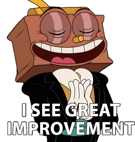 Ludwig from The Cuphead Show smiles with closed eyes, hands together, saying "I SEE GREAT IMPROVEMENT".