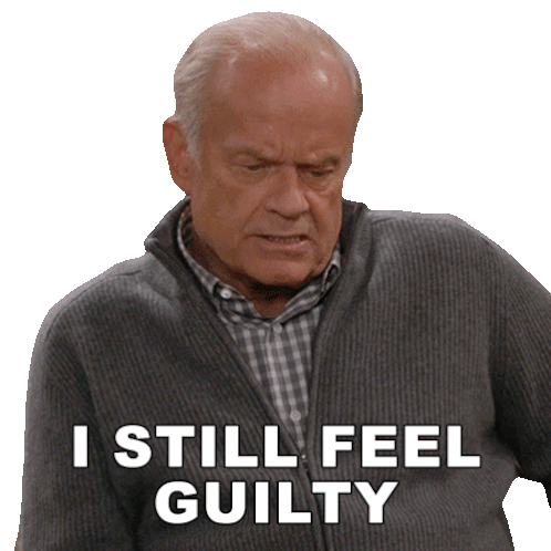 Frasier Crane, played by Kelsey Grammer, expresses deep remorse, stating 'I still feel guilty' with a somber expression.