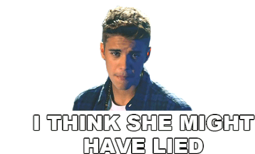 Justin Bieber reacts with the caption 'I THINK SHE MIGHT HAVE LIED', expressing doubt and disbelief.