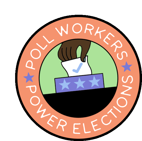 Circular sticker promoting civic engagement, featuring a hand casting a ballot into a box, with 'Poll Workers Power Elections' text.