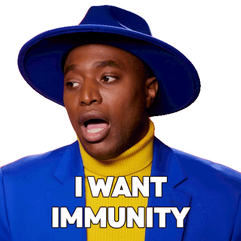 Sapphira Cristál, wearing a blue hat and yellow turtleneck, declares "I WANT IMMUNITY" from RuPaul's Drag Race.