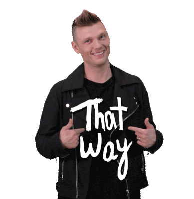 Nick Carter of Backstreet Boys smiles and points to 'That Way' on his shirt, referencing their hit song.