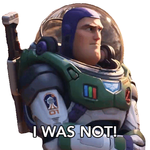 Buzz Lightyear in his iconic space suit, emphatically denying an accusation with the caption 'I WAS NOT!'