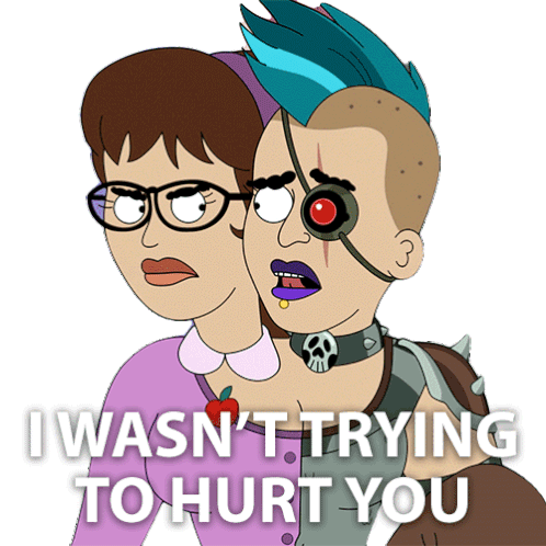 Mal from Farzar, with a cyborg look, expresses 'I Wasn't Trying To Hurt You' to a concerned woman, conveying an apology or defense.