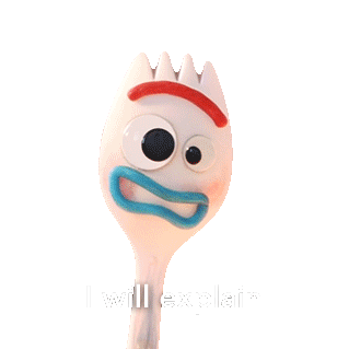 Forky from Toy Story 4, with big eyes and a blue mouth, says 'I will explain everything' in this animated sticker.