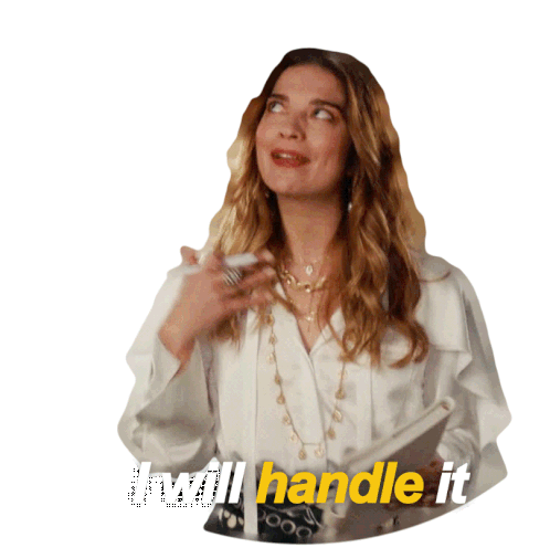 Alexis Rose from Schitt's Creek confidently declares 'I will handle it' with a dismissive hand gesture and hair flip, showing her capable attitude.