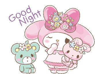 My Melody, Ibunwoo, and a bunny friend wish you good night with flowers in this sweet animated sticker.