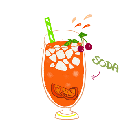 Animated sticker of a refreshing orange soda drink with ice, orange slices, and cherries, perfect for a hot day.