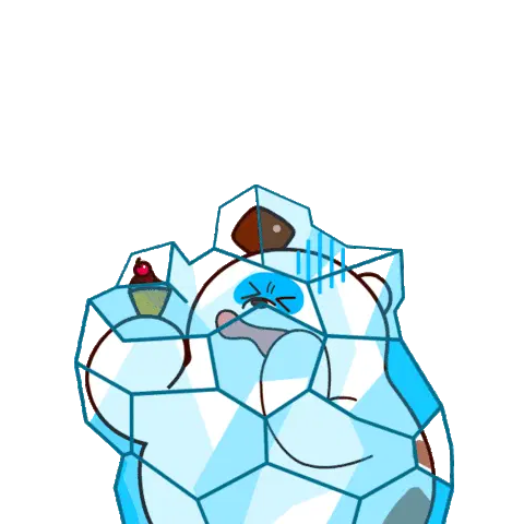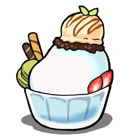 A cute cartoon bunny happily licks and eats a pink and blue two-scoop ice cream cone, showing pure delight.