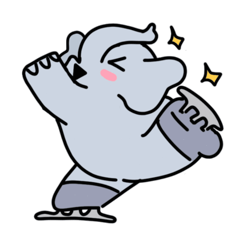 A cute cartoon elephant character performs an elegant figure skating pose with rosy cheeks and sparkling flair.