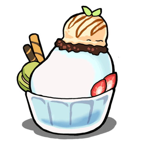 A cute, animated bingsu (shaved ice) dessert in a bowl, topped with ice cream, strawberries, and macarons, with musical notes floating around.
