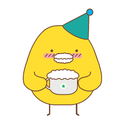 A cute yellow character in a party hat happily holds a frothy iced latte with a green star logo.