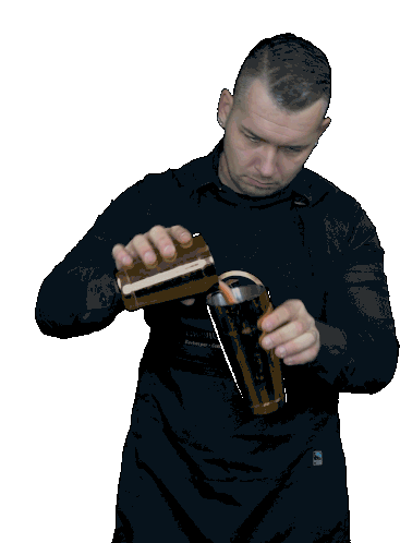 A skilled bartender pours a drink from one shaker to another, featuring the 'Ichwillcocktails' brand.