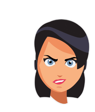 A cartoon woman with dark hair and blue eyes shows an angry or annoyed expression, furrowing her brows and slightly opening her mouth.