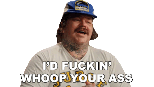 Matty Matheson, wearing a cap, emphatically declares 'I'D FUCKIN' WHOOP YOUR ASS' with a confident expression.