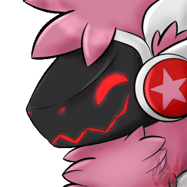 An animated sticker of a pink and black protogen character with headphones, featuring a glowing red visor expression.