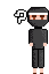 A pixel art ninja character stands idly, with a thought bubble appearing above its head, conveying a moment of contemplation.